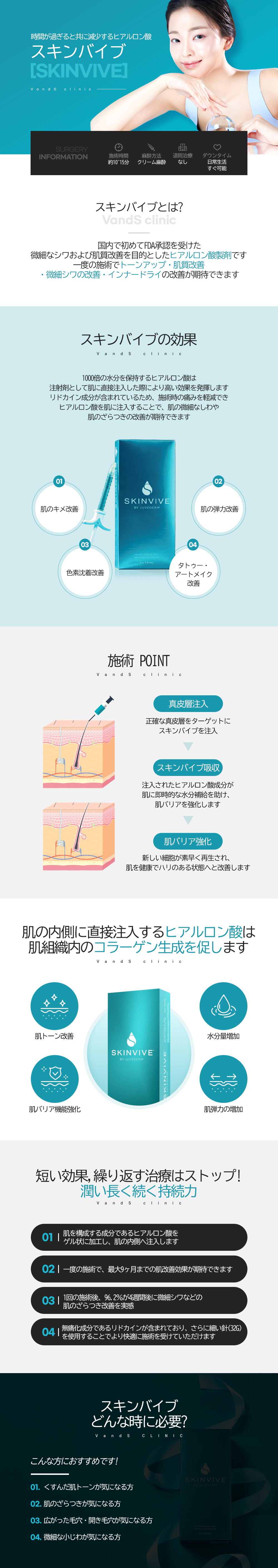スキンバイブは国内初のFDA承認を受けた小じわ及び肌のキメ改善用途のヒアルロン酸製剤です。 たった一度の施術で肌のトーンアップ、肌のキメ改善、小じわ解消、インナードライ改善が期待できます。